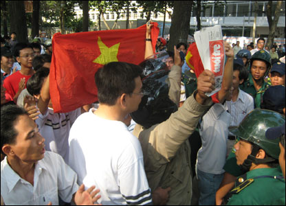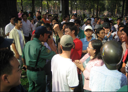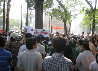 Bất chấp sự phong tỏa nghiêm ngặt trên khắp các tuyến đường quanh tòa lãnh sự Trung Quốc, đoàn người chuyển sang góc đường Alexandre de Rhodes và Phạm Ngọc Thạch, sau đó là trong khuôn viên công viên 30/4, phía sau nhà thờ Đức Bà.