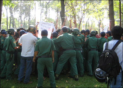 Lực lượng chống biểu tình gồm công an, dân phòng, và cảnh sát du lịch xuất hiện đông đảo. Đội ngũ cảnh sát du lịch này đã làm thành vòng trong bao vây, chia cắt và có lúc xô đẩy ngăn cấm đoàn biểu tình tuần hành.