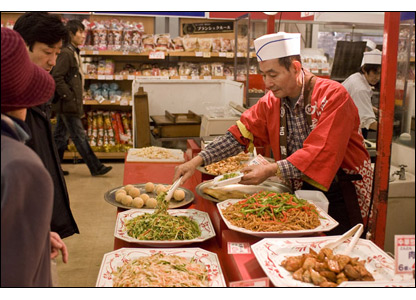 Các công chức ăn vội vàng trước khi lên tàu về nhà ở ga Shinjuku. Nhật Bản là nền kinh tế lớn thứ hai thế giới nhưng lại không sản xuất đủ thực phẩm cho người dân. Chỉ 39% lượng thực phẩm được sản xuất trong nước.