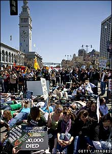 Những người biểu tình còn phản đối việc Trung Quốc tiếp tục ủng hộ cho Sudan, cho dù có những vụ xâm hại nghiêm trọng tại khu vực Darfur.