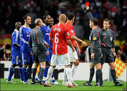 Khi trận đấu bước vào hiệp phụ, Drogba bị nhận thẻ đỏ vì tát vào mặt Vidic