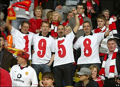 Một số cổ động viên của Alex Ferguson mặc đồ tưởng nhớ các danh thủ tử nạn trong vụ máy bay rơi ở Munich 1958
