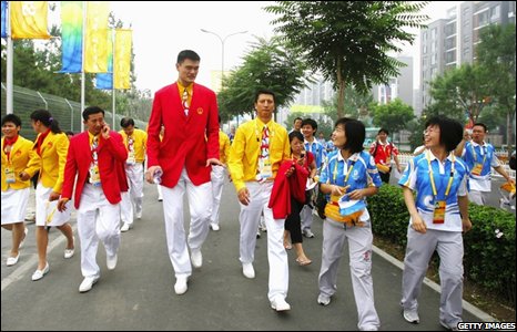 Ngôi sao bóng rổ Trung Quốc Diêu Minh (người cao nhất) tham gia đoàn Trung Quốc khai trương ngôi làng.