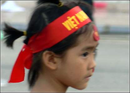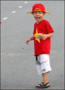 Có không ít các fan ‘nhí’ tới cổ vũ đội tuyển Việt Nam. Cậu bé này cười tươi khi được cầm chiếc vé trên tay.