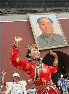 Các nghệ sĩ truyền thống thể hiện tài nghệ bên dưới tấm chân dung Mao Trach Đông khổng lồ.