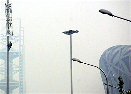 Cho dù khói bụi, một nhà hoạt động táo bạo đã leo lên một cột điện để treo biểu ngữ 'Tây Tạng tự do' gần sân vận động Tổ Yến. | CÁC BÀI LIÊN QUAN Thế vận hội Bắc Kinh 200827 Tháng 7, 2008 | Chuyên đề | ||||||||||||||||||||||||||||||||||||||||||||||||||||||||||||||||||||||||||||