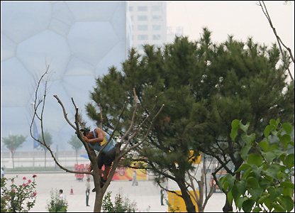 Bên ngoài sự chuẩn bị cũng đang tiếp tục. Một người thợ đang chặt bớt ngọn cây - Bắc Kinh đã gấp rút trồng hàng trăm ngàn cây xanh, hàng triệu luống hoa trước ngày hội.