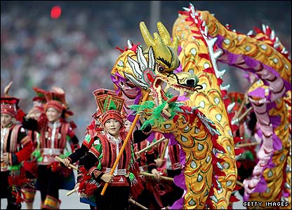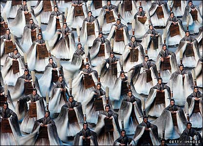 Lễ khai mạc được tô điểm bởi hàng ngàn diễn viên với trang phục thể hiện bề dày văn hóa Trung Quốc.