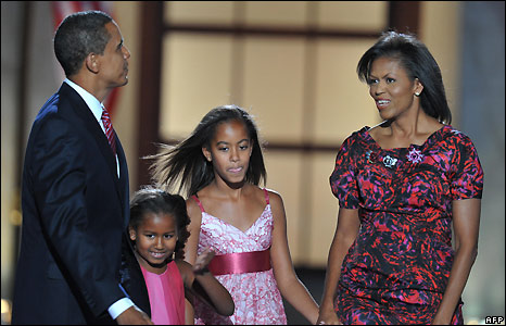 Sau bài diễn văn, phu nhân Michelle và các con gái Sasha (trái) và Malia (phải) đã lên sân khấu cùng ông Obama. Bà Michelle Obama có bài diễn văn vào tối khai mạc đại hội đảng hôm thứ Hai.