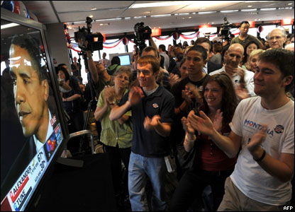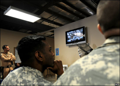 Lính Mỹ xem truyền hình trực tiếp kết quả bỏ phiếu tại căn cứ quân sự Bagram ở Afghanistan. Vị tổng thống da màu đầu tiên trong lịch sử có thể sẽ thay đổi nền chính trị và vị trí của Hoa Kỳ trên thế giới.