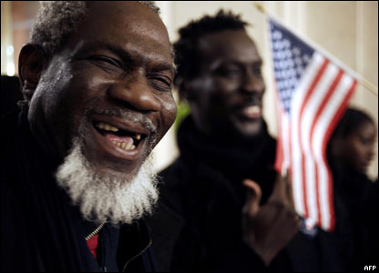 Các ủng hộ viên người Pháp ở Quận Ba, Paris, ăn mừng khi ông Barack Obama tuyên bố trở thành Tổng thống thứ 44 của Hoa Kỳ.
