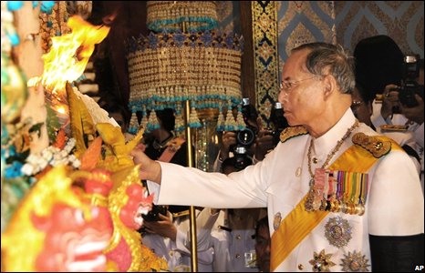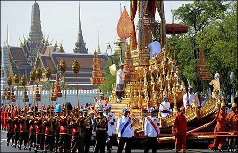 Binh lính mặc áo đỏ kéo chiếc thuyền sơn son thiếp vàng tới đài hóa thân bẩy tầng dành chị gái của nhà vua, công chúa được nhiều người ngưỡng mộ, Galyani Vadhana, qua đời vì ung thư