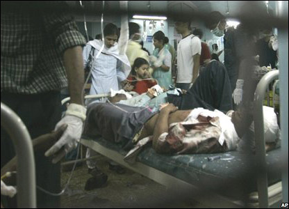 Người bị thương được chở đi cấp cứu nhưng hàng trăm người còn mắc lại bên trong khách sạn Oberoi, nơi phát ra tiếng nổ lớn.