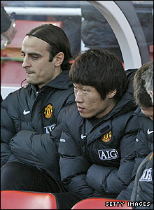 Dimitar Berbatov (trái) tỏ ra lo lắng ở hiệp nhất, vì phải ngồi ổ ghế dự bị