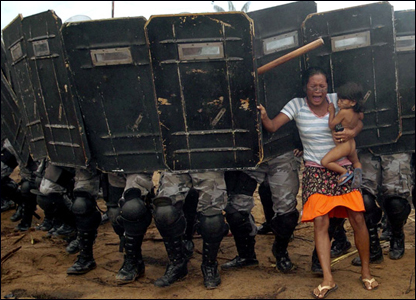 Một phụ nữ thổ dân ngăn cản bước tiến của cảnh sát bang Amazonas. Lực lượng này sau đó đã đẩy lui khoảng 200 thành viên của Phong trào Không đất đai ra khỏi một khu đất do tư nhân sở hữu ở Manaus, trung tâm Amazon của Brazil.