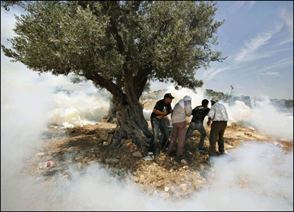 Những người biểu tình Palestine tìm chỗ nấp trong vòng vây hơi cay của lính Israel trong một cuộc tuần hành ở làng Nilin, trên Bờ Tây.