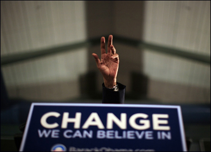 Hình ảnh thượng nghị sĩ Barack Obama bắt đầu chiến dịch tranh cử, và 12 tháng sau ông được bầu làm tổng thống Hoa Kỳ.