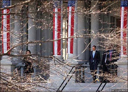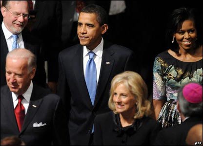 Ông Barack Obama bắt đầu một ngày làm việc bận rộn trong cương vị Tổng thống thứ 44 của nước Mỹ bằng việc đến dự một buổi lễ tại Thánh Đường Quốc gia Washington cùng Phu nhân Tổng thống Michelle Obama.