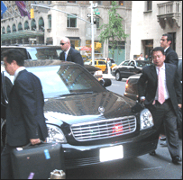 Ngoài BBC, chỉ có hãng thông tấn AP cử một phóng viên nhiếp ảnh và phóng viên quay phim tới. Họ muốn loan đi những hình ảnh Chủ tịch Việt Nam tới khách sạn ở New York. Các nhân viên mật vụ nhìn chúng tôi với ánh mắt tò mò, nhưng thân thiện. Có lẽ họ quá quen với cảnh phóng viên săn tin mọi lúc mọi nơi. Khoảng 20 phút trước khi đoàn tới, các nhân viên mật vụ bỗng đi đâu hết, cửa chính vào khách sạn vắng tanh. Anh phóng viên nhiếp ảnh của AP lo âu: “Lạ thật, họ đi đâu hết nhỉ. Khách sạn có mấy cửa đi liền, biết họ sẽ vào cửa nào bây giờ.” Nhưng rồi với kinh nghiệm nhiều năm trong nghề, anh quyết định cứ đứng chỗ nào có mật vụ đứng. Anh cũng biết trước khi đoàn Việt Nam tới, phố xá sẽ bỗng nhiên im lặng và sau đó là tiếng còi ủ. Như vậy chúng tôi sẽ có đủ thời gian để chạy tới nơi đoàn xe về khách sạn. Trong lúc chờ đợi đoàn tới, chúng tôi cũng hỏi nhân viên phụ trách báo chí của Đại sứ quán Việt Nam về chuyện chính xác khi nào đoàn tới. Tôi cũng đề nghị được tới cuộc gặp của Chủ tịch Việt Nam với kiều bào ở New York vào lúc 21h. Trước khi tới Mỹ tôi đã biết khó có thể trông chờ gì vào sự hợp tác của người mà vai trò là giúp đỡ báo chí này, nhưng tôi cứ cố hết sức. Trong thời gian ở New York tôi còn có những cơ hội khác để đưa ra những đề nghị trợ giúp mà tất cả đều có chung số phận đã biết trước. Cửa phụ Không có được thông tin gì từ phía Việt Nam, nhưng tôi tin rằng ông Triết sẽ tới khách sạn không sai với lịch trình dự kiến là mấy.
