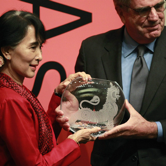 • Bà Suu Kyi nhận giải thưởng 'Viễn kiến Toàn cầu' của Viện Asia Society, từ tay ông Tom Freston sau khi đọc diễn văn tại Viện Hòa bình ở Washington hôm 18/9.