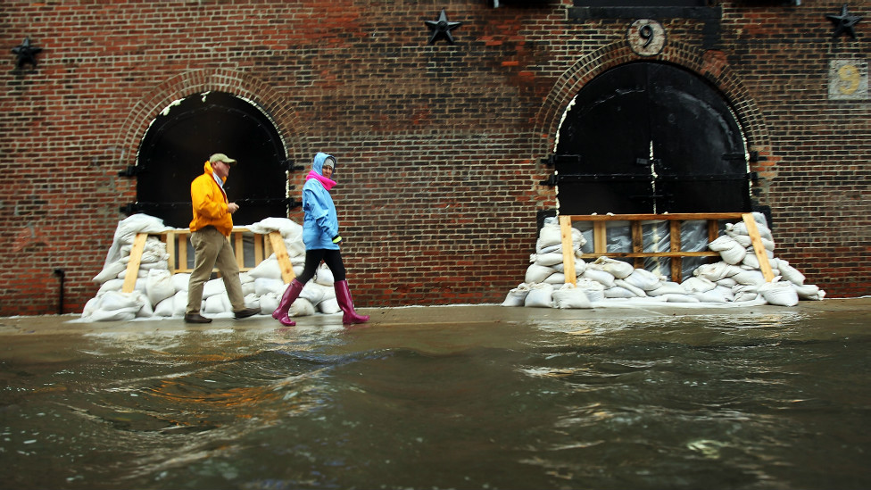 Người dân đi ngang qua khu đường phố ngập nước và mấy bao tải cát chặn lụt ở khu Red Hook, gần Brooklyn ở thành phố New York. Bão Sandy chưa tới nhưng đã gây mưa lớn.