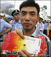 Hàng ngàn người đổ tới các quầy phát hành ở thủ đô Bắc Kinh để tìm cách mua bằng được những tấm vé Olympics cuối cùng. Cảnh sát đã phải tăng cường lực lượng tại một trung tâm bán vé gần các khu vực thi đấu chính kỳ Olympics sắp tới để kiềm chế đám đông. Vé xem các trận quan trọng đã được tranh cướp hết chỉ trong vài giờ đồng hồ. Tổng số có 820 ngàn vé được bán ra từ lúc 9:00 sáng giờ địa phương. Tuy nhiên, có người đã tới xếp hàng từ mấy hôm trước. Mỗi người chỉ được phép mua tối đa hai vé. Nơi hỗn loạn nhất là quầy vé gần các điểm thi đấu Olympic chính; cảnh sát đã phải đẩy lui đám đông. Nhiều người ướt sũng mồ hôi khi lên tới sát được quầy bán vé. Một người nói ông ta đã nhảy cóc được hàng dài đúng vào lúc đám đông gây hỗn loạn.
