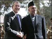 Tổng thống Hoa Kỳ cùng người tương nhiệm phía Nam Hàn nói họ đã bàn thảo các biện pháp tăng cường hợp tác quân sự, đẩy nhanh tiến độ phê chuẩn thỏa thuận mậu dịch tự do và thuyết phục Bắc Hàn cho phép thanh sát viên quốc tế kiểm tra quá trình từ bỏ vũ khí. Tổng thống Nam Hàn Lee Myung-Bak mô tả liên minh với Hoa Kỳ là xương sống trong chính sách đối ngoại của mình. Ông nhậm chức cách đây năm tháng và nay đã gặp Tổng thống Bush ba lần. Lần này họ cam kết đẩy nhanh văn bản tiến tới việc phê chuẩn thỏa thuận mậu dịch tự do, và nói về kế hoạch củng cố linh minh quân sự có bề dày nhiều năm. Đề nghị giúp Afghanistan Tại buổi họp báo, ông Bush nói ông đã đề nghị ông Lee cân nhắc cho điều ông gọi là sự hỗ trợ cho Afghanistan nhưng không tham chiến. Tổng thống Bush nói: "Tôi cảm ơn Tổng thống Lee về những đóng góp của Nam Hàn cho Afghanistan"