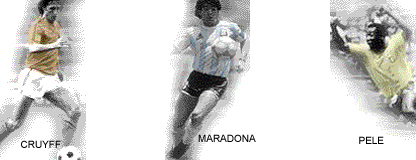 JOHANN CRUYFF - HÀ LAN Bóng đá Hà Lan được thế giới biết tiếng là nhờ cuộc cách mạng khởi đầu từ Ajax Amsterdam với cây ghi bàn Johan Cruyff. Danh thủ này sinh ra ngay cạnh Ajax, và ông tham gia đội thiếu niên của câu lạc bộ khi lên 10. Ông chính thức bắt đầu sự nghiệp năm 17 tuổi. Ông tham gia vào đội hình thi đấu của Hà Lan năm 1966 và 1971, và giành 3 danh hiệu cầu thủ xuất sắc nhất châu Âu. Năm 1973, ông ký hợp đồng với Barcelona và một năm sau đó trở thành nhân tố quyết định đưa Hà Lan vào trận chung kết World Cup. Dù thua Đức với tỉ số 1-2, khả năng chơi bóng của các cầu thủ Hà Lan khiến thế giới phải sửng sốt, và Cruyff được công nhận là người kiến tạo ra lối chơi hết sức ấn tượng này. Cruyff tiếp tục sự nghiệp bóng đá của mình cho tới khi từ giã Feyenoord, Rotterdam, năm 1984. Bạn có biết? Sau đó, Cruyff quay trở lại làm huấn luyện viên cho Ajax và đưa câu lạc bộ này tới chiến thắng trong giải Recopa năm 1987. Khi chia tay Ajax, ông đã không chiến thắng nổi cám dỗ sang huấn luyện cho Barcelona và đã đưa câu lạc bộ xứ Catalan này giành chiến thắng đầu tiên trong cúp vô địch bóng đá châu Âu năm 1992. DIEGO MARADONA - ARGENTINA Không mang vóc dáng của một vận động viên - vì vừa lùn lại vừa béo - thế nhưng tài năng của cầu thủ này trên sân thì khỏi phải nói: khi xem Maradona thi đấu, có vẻ như anh là cầu thủ duy nhất chơi trên sân. Một số cơ hội đã chứng tỏ điều này. Rất nhiều người khẳng định Maradona là người đã một mình chiến thắng World Cup năm 1986. Mười cầu thủ còn lại chỉ là dàn đồng ca minh họa cho màn độc diễn của riêng anh. Sinh năm 1960 tại ngoại ô Buenos Aires, Maradona bắt đầu chơi bóng từ khi lên 9 tại câu lạc bộ thiếu nhi Argentinos Juniors. Anh trở thành cầu thủ chuyên nghiệp cho câu lạc bộ này năm tròn 16 tuổi. Chỉ sau bốn tháng, anh được mời chơi cho đội của người lớn. Tuy nhiên, Cesar Luis Menotti không đưa Maradona vào đội hình World Cup năm 1978, mà năm đó, Argentina chiến thắng. Mặc dù màn trình diễn của Maradona tại World Cup năm 1982 có vẻ còn hơi mờ nhạt, anh thể hiện mình rõ nét nhất tại Mexico năm 1986. Anh còn tỏa sáng trong thời gian chơi cho Boca Juniors (Argentina) và câu lạc bộ Naples của Ý - nơi anh thi đấu trong 7 năm. Bạn có biết? Sự nghiệp thể thao của cầu thủ này bị tổn hại vì vấn đề ma túy. Maradona bị cấm thi đấu trong World Cup 1994 tại Mỹ sau khi bị kiểm tra doping với kết quả dương tính. Maradona từ giã sự nghiệp bóng đá năm 2001. PELÉ - BRAZIL Biệt danh: Ông Vua. Trong thế giới bóng đá, chỉ cần nghe hai từ này là người ta biết bạn đang nói về ai: Edson Arantes Do Nascimento, Pele. Từ màn trình diễn xuất sắc trong World Cup 1958 tại Thụy Điển, năm ông mới 17 tuổi, cho tới khi từ giã sự nghiệp năm 1977, Pele luôn được coi là tài năng rực sáng trên sân cỏ. Kỷ lục chưa có ai phá nổi của Pele: 1281 bàn thắng trong 1363 trận đấu và 92 lần thi đấu cho đội tuyển quốc gia Brazil đã khẳng định danh hiệu này. Được chọn vào đội hình thi đấu của Brazil năm 1970 - khi đó được coi là đội hình hùng mạnh nhất của mọi thời đại - Pele đã thể hiện đỉnh cao trong sự nghiệp bóng đá của mình. Khi đó ông tròn 30 tuổi. Bắt đầu cuộc đời cầu thủ trước đó 15 năm, và giành vô địch World Cup năm 1958, tuy nhiên, Pele phải đợi 13 năm nữa mới được nếm lại mùi vinh quang của World Cup. Cả giải vô địch bóng đá tại Chile năm 62 và tại Anh năm 66, Pele phải ngồi ghế dự bị theo dõi các trận đấu do bị chấn thương. Bạn có biết? Năm 1974, Pele nghỉ chơi bóng đá để rồi lại quay trở lại một năm sau đó, chơi cho đội Cosmos của Mỹ. Ông thực sự từ giã sân cỏ năm 1977.