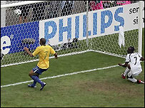 Trận 7 vòng 2 Sân: Dortmund Ngày: Thứ Ba, 27/6 Giờ: 1500 GMT Đây là trận đấu của 2 trường phái ngẫu hứng, châu Phi và Mỹ La Tinh. Ngay ở phút đầu tiên của trận đấu, Ronaldinho đã có đường chuyển cực kỳ chính xác cho Ronaldo dùng tốc độ dẫn xuống, nhưng bị việt vị. Phút 4, Kaka đã có đường chuyền hóc hiểm cho Ronaldo, anh đảo người khéo léo, tiền đạo này đã dễ dàng loại bỏ thủ môn Kingston trước khi dứt điểm vào khung thành bỏ trống mở tỷ số 1-0 cho Brazil. Phút 42, Brazil hưởng phạt góc, tiền đạo Asamoah Gyan không bị ai kèm đã nhảy lên đánh đầu hiểm hóc, nhưng bóng lại bật đúng chân thủ môn Dida dù rằng thủ thành này đã hoàn toàn bó tay.