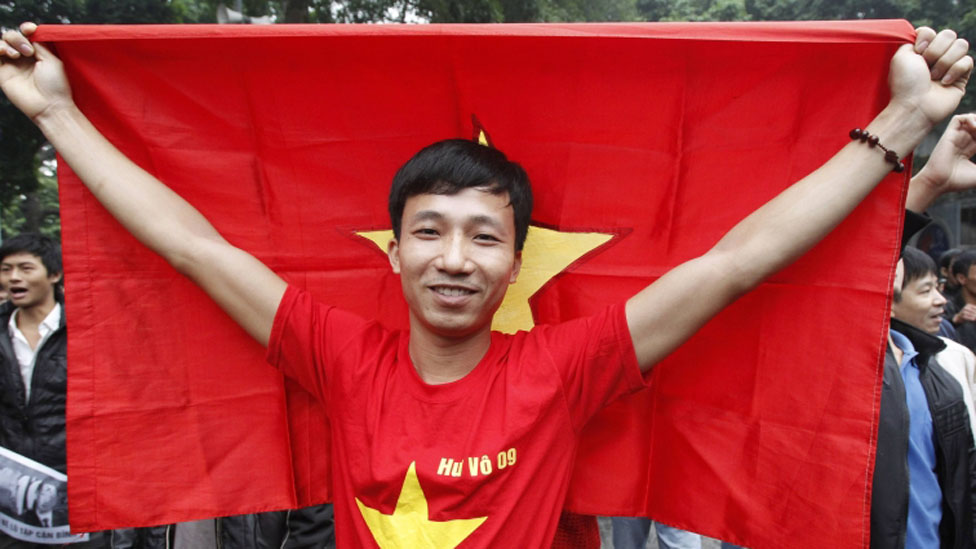 • Một người biểu tình giương cờ Việt Nam trong cuộc tuần hành ngắn ngủi sáng Chủ Nhật 9/12 ở Hà Nội. (Ảnh Reuters/stringer)