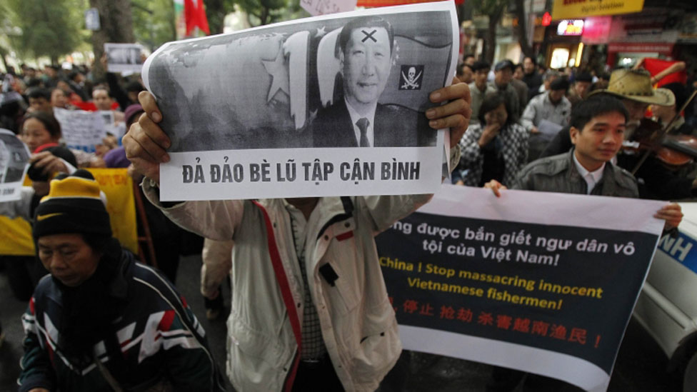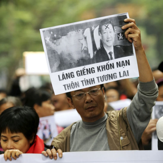• Một số người biểu tình nhằm trực diện lãnh đạo mới của Trung Quốc - ông Tập Cận Bình. Trong một tháng nay, Trung Quốc đã có nhiều hành động leo thang ở Biển Đông. (Ảnh AP/Na Son Nguyen)