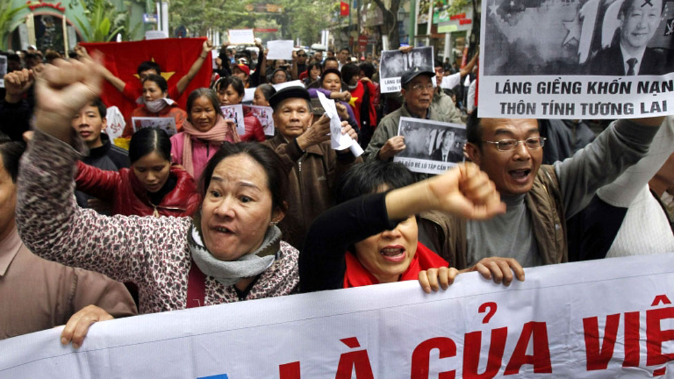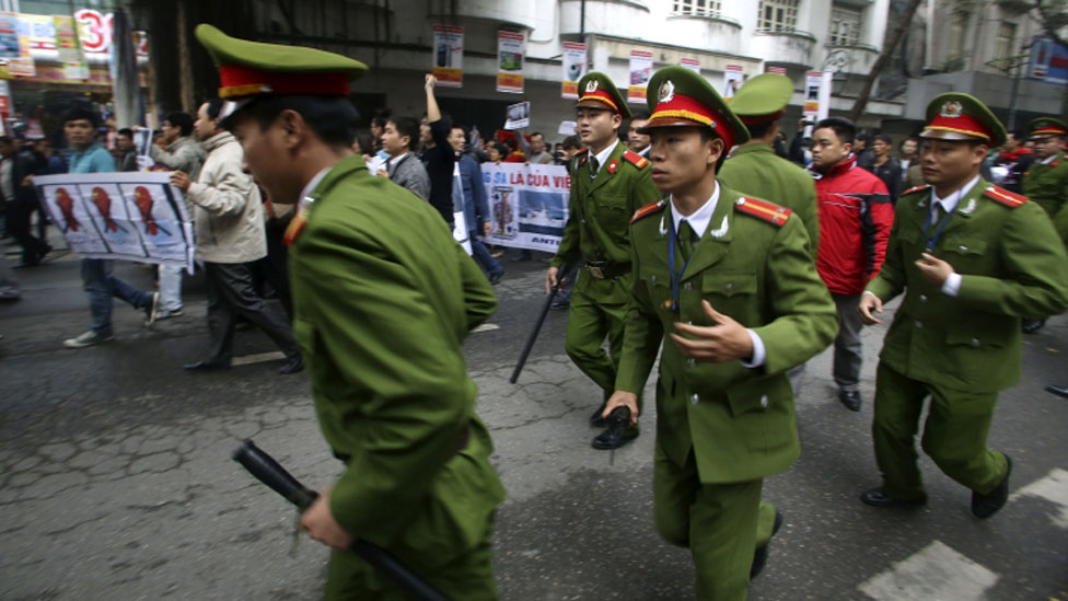 • Hàng trăm cảnh sát viên và an ninh được huy động tới giải tán biểu tình ở cả Hà Nội và TP HCM. Đã có khoảng 20 người biểu tình bị bắt. (Ảnh AP/Na Son Nguyen)