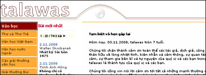 Trang Talawas có trụ sở tại Đức tuyên bố đóng cửa sau bảy năm tồn tại như một diễn đàn thảo luận văn học và chính trị-xã hội cho trí thức ở Việt Nam và hải ngoại. Mạng điện tử do nhà văn Phạm Thị Hoài chủ trương ra tuyên bố trên trang nhất ở địa chỉ talawas.de rằng diễn đàn này ngưng hoạt động “trong hình thức hiện tại”. Tin này được một số văn nghệ sĩ cộng tác thường xuyên với Talawas ở Việt Nam nói không phải là “điều gây ngạc nhiên”. Từ một thời gian qua, giao diện của trang trở nên quá tải và gánh nặng công việc vượt qua mức độ xử lý nổi của một ban biên tập làm việc thiện nguyện. Nổi tiếng là một không gian mạng tự do cho trí thức tại Việt Nam bày tỏ quan điểm, tránh sự kiểm soát của nhà chức trách, Talawas đã thu hút một số lượng đáng kể giới cầm bút trong và ngoài nước. Cũng theo chính tuyên bố trên Talawas hôm 3/11, chính quyền “đặt tường lửa từ tháng 5/2004” ngăn người đọc tại Việt Nam vào trang. Việc này đã gây khó khăn cho trang, cũng như tin nói một số cộng tác viên bị công an văn hóa ở Việt Nam làm khó dễ. Nhưng rộng hơn, chính việc trộn lẫn các đề tài lịch sử, văn hóa, nghệ thuật và chính trị, cùng bút chiến trong ngoài nước và cách trình bày mang nhiều tính tư liệu nặng nề khiến trang khó vươn ra khỏi giới độc giả chuyên môn. Hiện chưa rõ nếu quay trở lại trong một hình thức mới vào 15/3/2009, như ban biên tập hứa hẹn, nhóm chủ trương sẽ đưa ra cách thức gì để giải quyết các vấn đề nêu trên. | CÁC BÀI LIÊN QUAN Độ lùi cần thiết sau bảy năm Talawas04 Tháng 11, 2008 | Văn hóa | ||||||||||||||||||||||||||||||||||||||||||||||||||||||||||||||||||||||||||||