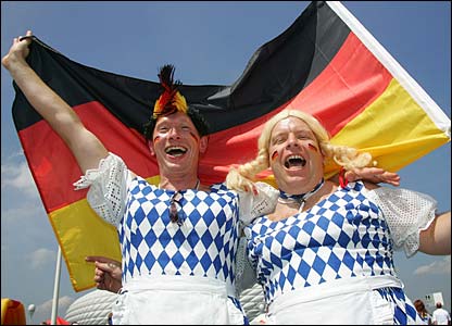 Hai cổ động viên đội tuyển Đức mặc đồ cải trang thành hai cô gái vắt sữa để cổ vũ cho đội nhà trước trận gặp Thụy Điển