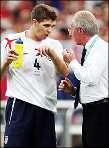 Lối chơi kém hiệu quả của đội Anh khiến cho Steven Gerrard phải ra thảo luận về chiến thuật với huấn luyện viên Sven-Goran Eriksson nhân phút tạm nghỉ trong trận
