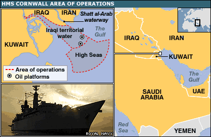 Giới chức Iran cảnh báo có thể sẽ khởi tố 15 lính Hải quân Hoàng gia Anh bị bắt hôm thứ Sáu tuần trước. Bộ ngoại giao Iran nói vấn đề được xem xét "về mặt pháp lý" và cho rằng có thể sẽ khởi tố. Thủ tướng Anh Tony Blair và ngoại trưởng Margaret Beckett lại khẳng định toán lính này không vi phạm lãnh hải Iran. Bộ ngoại giao nói sẽ tiếp tục gây sức ép để có quyền gặp những người bị bắt và tìm hiểu thông tin. Hôm Chủ Nhật, đại sứ Anh ở Iran Geoffrey Adams gi gặp giới chức Tehran nhưng không thể biết được nơi giam giữ 8 thủy thủ và 7 lính thủy đánh bộ, cũng như không thể dùng quyền lãnh sự để gặp họ. Cách đây 3 năm từng có 8 binh sĩ Anh bị Iran bắt sau một vụ đụng độ tương tự. Cựu thủy quân lục chiến Scott Fallon thuộc nhóm này, kể lại với đài BBC rằng khi đó ông bị đem ra giả xử tử và cáo buộc tội hoạt động gián điệp. Vi phạm hay không vi phạm lãnh hải "Họ chỉ muốn biết nhiệm vụ mà chúng tôi được giao là gì, và tại sao có mặt ở đó, tại sao có mặt ở Iran" "Chúng tôi không thể trả lời những câu hỏi đó, vì nhiệm vụ của chúng tôi là ở Iraq, là nơi đóng quân, và tôi nghĩ rằng lần này cũng như vậy". - Ông suy đoán. Lần này, nhóm binh sĩ có một binh sĩ nữ, vừa kết thúc việc kiểm tra một chiếc thuyển Iraq và trở về hai thuyền nhỏ để quay lại chiến hạm Cornwall. Iran nói rằng lực lượng này đã đi qua lãnh hải của họ, trong khi Anh quốc bác bỏ cáo buộc đó, nói rằng các binh sĩ làm nhiệm vụ như thường lệ trên phần biển của Iraq. Thủ tướng Tony Blair nói hôm Chủ Nhật rằng việc Iran bắt giữ lính Anh là "vô căn cứ và sai trái". Ngoại trưởng Iran Manouchehr Mottaki hôm Chủ Nhật cũng lên tiếng ở New York, nói rằng việc bắt giữ lính Anh liên quan đến vụ việc "xâm nhập trái phép lãnh hải Iran và vụ này sẽ được đem ra pháp luật". Bản đồ phạm vi hoạt động của chiến hạm Cornwall