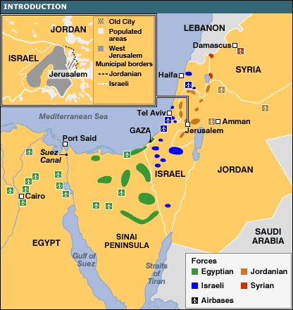 Căng thẳng gia tăng vào tháng Năm khi lực lượng của Liên Hiệp Quốc rút đi và Ai Cập điều động quân tới Sinai và dải Gaza. Cuộc chiến tranh Trung Đông 1967, còn gọi là Cuộc chiến 6 ngày là lần xung đột thứ ba giữa Israel với Ai Cập, Jordany và Syria. Lần đầu tiên là vào năm 1948, và kết quả là miền đông Jerusalem và bờ tây sông Jordan thuộc quyền kiểm soát của Jordany còn dải Gaza thuộc quyền kiểm soát của Ai Cập. Vào năm 1956, Israel xâm chiếm dải Gaza và bán đảo Sinai của Ai Cập. Israel bị buộc phải rời khỏi Sinai vào năm sau và Lực lượng khẩn cấp của Liên hiệp quốc - Unef - được điều động tới đây. Căng thẳng vẫn tiếp tục gia tăng và các phe nhóm dân quân mới của Palestin bắt đầu tiến hành các cuộc tấn công qua biên giới với sự hỗ trợ của phe Ả Rập. Tổng thống Ai Cập, Gamal Abdel Nasser, rất muốn thống nhất thế giới Ả Rập và đã nói tới việc "phá hủy Israel", trong khi Israel lo sợ rằng nước này có thể bị xóa bỏ trên bản đồ thế giới. Vào tháng Năm 1967, Tổng thống Nasser đòi lực lượng Nnef phải rút khỏi Sinai, đóng cửa eo biển Tiran đối với tàu bè của Israel và ký một thỏa thuận quốc phòng với Jordany. Một số sử gia đặt câu hỏi liệu ông Nasser có dự định tiến hành chiến tranh hay chăng nhưng cả ba diễn biến này cùng với việc điều động quân của Ai Cập tới Sinai đã dẫn tới việc Israel quyết định tấn công trước. Và cuộc chiến kéo dài sáu ngày, từ ngày 5 tháng Sáu tới ngày 10 tháng Sáu năm 1967.