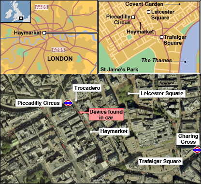 Cảnh sát đã vô hiệu hoá một bom xe có chứa các bình khí đốt ở ngay trung tâm thủ đô London. Nhân viên cảnh sát đã tiến hành một vụ nổ có kiểm soát sau khi có tin tức nói một chiếc xe đáng ngờ đậu tại Haymarket vào lúc trước 2 giờ sáng (0100GMT). Khu vực đã bị phong toả để cảnh sát điều tra cái được cho là một "thiết bị có khả năng gây nổ." Thủ tướng Gordon Brown nói Anh quốc đang đối diện một "mối đe doạ nghiêm trọng và liên tục." Ông nói thêm công chúng luôn luôn "cần phải cảnh giác." Lời nhận xét của thủ tướng được tân Bộ trưởng nội vụ Jacqui Smith ủng hộ. Bà hiện đang chủ trì cuộc họp của nhóm khẩn cấp Cobra thuộc chính phủ. Phóng viên BBC Andy Tighe nói thời điểm diễn ra vụ việc lại đúng một ngày sau khi ông Gordon Brown trở thành thủ tướng, và là dịp chuẩn bị kỷ niệm hai năm vụ đánh bom London 7 tháng Bảy. Một nhân chứng báo tin có nhìn thấy các bình khí đốt được đưa khỏi chiếc xe Mercedes màu bạc vào lúc 4 giờ sáng (0300GMT). Một số người có mặt tại một hộp đêm gần đó nói họ nhìn thấy chiếc xe được lái chuệch choạc và rồi đâm vào một thùng rác. Họ nói tài xế sau đó ra khỏi xe và bỏ chạy. Các nguồn tin cảnh sát xác nhận các bình gas có liên quan tới vụ việc xảy ra gần Piccadilly Circus. Tuy nhiên, sở cảnh sát Anh Scotland Yard không bình luận về các tường thuật về số lượng lớn các đinh găm được tìm thấy bên trong chiếc xe.