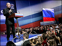 Còn chưa đầy hai tuần trước khi có kỳ tổng tuyển cử tại Nga, Tổng thống Putin đã ra đòn tấn công các nhân vật chính trị đối lập bằng việc ví họ như lũ chó hoang ăn của bố thí của các sứ quán nước ngoài. Trong buổi ra mắt đám đông ủng hộ viên của mình, ông Putin nói rằng Phương Tây muốn giở trò bẩn. Ông nói "những ai đối đầu với chúng ta không muốn thực hiện kế hoạch của chúng ta bởi họ có các kế hoạch cho nước Nga hoàn toàn khác biệt". Tổng thống Nga cáo buộc những nhân vật đối lập muốn có một nước Nga yếu thế, vô tổ chức và xã hội bị chia rẽ. Ông Putin cũng cảnh báo các giới đầu sỏ vốn thao túng chính trường Nga hồi thập niên 1990 đang lên kế hoạch trở lại. Mặc dù sẽ từ bỏ ghế tổng thống vào năm sau nhưng ông Putin tỏ ý ông sẽ vẫn hoạt động chính trị, có thể là với tư cách là thủ tướng. Ông nói là ông sẽ lãnh đạo đảng Thống nhất Nga trong kỳ bầu cử quốc hội vào tháng Mười Hai mặc dù ông không phải là đảng viên. Đảng của ông được sự hậu thuẫn khá lớn và theo dự kiến sẽ thắng với đa số phiếu. Các nhóm đối lập và nhân quyền đã chỉ trích và cáo buộc ông Putin đang dùng lối cũ thời Liên Xô cũ để hình thành một nhà nước độc đảng toàn trị. | |||||||||||||||||||||||||||||||||||||||||||||||||||||||||||||||||||||||||||||