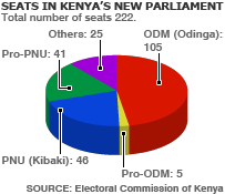 Phe đối lập Kenya đã giành chiến thắng trong kỳ bỏ phiếu quan trọng, bầu chức Chủ tịch quốc hội, tại cuộc họp đầu tiên của quốc hội. Sự kiện trên diễn ra sau kỳ bầu cử gây nhiều tranh cãi, nguyên nhân gây bùng nổ một làn sóng bạo lực tại nước này. Ứng viên phe đối lập đã giành được chiến thắng với chỉ vỏn vẹn hơn bốn phiếu bầu trong ba vòng bầu bán căng thẳng, sau các cuộc tranh cãi nảy lửa về thủ tục bỏ phiếu. Phe đối lập, vốn cáo buộc kỳ bầu cử tổng thống là có sắp đặt, sợ rằng việc bầu chọn Chủ tịch quốc hội cũng bị dàn xếp trước. Phiên họp quốc hội cũng là lần đầu tiên lãnh tụ đối lập Raila Odinga và Tổng Thống Mwai Kibaki cùng ngồi chung một phòng kể từ sau ngày bầu cử 27.12.2007. Có hơn 600 người đã thiệt mạng trong các vụ bạo loạn sau đó. Ăn mừng Việc bầu chọn Chủ tịch quốc hội, nhân vật có thế lực hàng thứ ba tại nước này, khởi đầu giữa lúc có xảy ra những đụng độ gay gắt, khi phe đối lập Phong Trào Dân Chủ Cam (ODM) kêu gọi biểu quyết công khai thay vì bỏ phiếu kín.