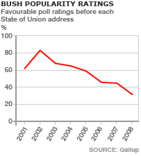 Thêm vào đó Tổng thống bush sẽ thúc giục chính phủ Iran hãy ngưng chương trình làm giàu chất uranium và hãy 'nói thẳng' những ý định của họ, theo những đoạn trích được Tòa Bạch Ốc đưa ra. Về Iraq, ông Bush được cho là sẽ ca ngợi những thành quả của lực lượng Mỹ và Iraq trong việc đạt được 'những kết quả mà chỉ rất ít người trong chúng ta có thể tưởng tượng được cách đây một năm'. Bài Diễn văn liên bang lần này sẽ là lần thứ bảy của Tổng thống Bush và cũng là lần cuối trước khi ông rời nhiệm sở vào tháng Giêng năm 2009. Theo các cuộc thăm dò dư luận của Gallup về tỉ lệ ủng hộ ông vào thời điểm có các bài Diễn văn liên bang thì đây là năm tồi tệ nhất kẻ từ khi ông lên nắm quyền. | |||||||||||||||||||||||||||||||||||||||||||||||||||||||||||||||||||||||||||||