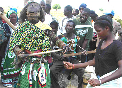 This masked 'likishi' or traditional dancer added to the party atmosphere in Kaoma.