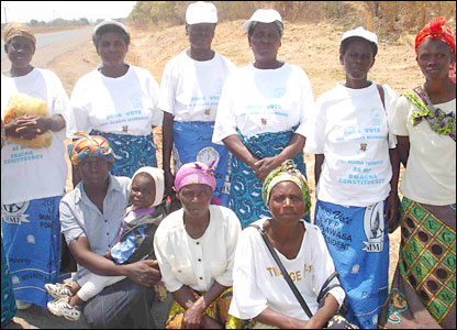 The team stopped at the town of Kaoma on their way west. A group of women dressed in chitenges branded with UDA colours and logos, dance and sing in support of the alliance's campaign.