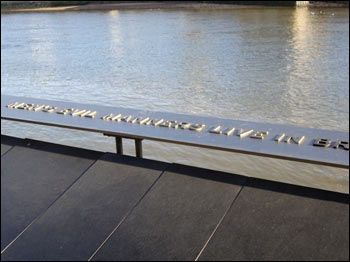 Let me explain. I’ve still got something to say about the morning walk. To get to work I have been walking from London Bridge railway station, along the northern bank of the River Thames, heading west. I showed you the pictures last time. But I have since discovered I can also get to work walking along the southern bank of the Thames, also heading West. And I can’t resist showing you two things. First, there is a steel barrier between me and the river, and there is something very interesting written on it. The problem is, I am not a good photographer, and I was too close to get the whole phrase in my photograph. So let’s see if you can solve the puzzle: