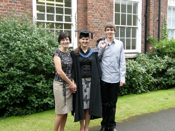 Bia, My daughter is 21 years old. At the age of 16 she went to the USA where she studied in her third year of high school as an exchange student, which she really enjoyed. After she arrived from the USA she took her final exams in Slovakia. This experience helped her to apply to go to university in England. She graduated with a first –class degree in psychology from the University of Reading, UK in June 2008. She is living and working in London now, trying to save as much money as possible because her future plan is to travel and work as a teacher in South America before pursuing for her Master’s degree. She has recently taken a training course to be an EFL teacher. At the moment it looks like that the first destination will be Ecuador, then Peru, Argentina and Brazil. But things can change very quickly with her. I have attached a photo of my daughter, son and me taken in the garden of her university before the graduation ceremony in June 2008.