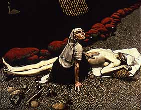 The pictures are by two very highly respected Finnish artists Akseli Gallen-Kallela and Hugo Simberg. The titles of the paintings are Mother of Lemminkäinen (Kalevala) and a wounded angel by Simberg.