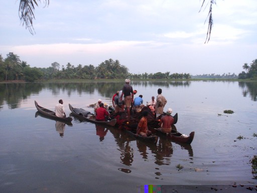 small house boatA big house boat.Kerela means land of coconut. Coconut oil and milk are very much used for cooking food. For me it was so difficult to eat for the first few days. Later, I became accustomed anyhow. The Pamba river, houses and coconut groves.We stayed for five days in Tommy's uncle's house. Though Tommy was in mourning he took us for boat ride in Pamba River. He has his own boat and he used to drive it. Next day he took us to show us the fishing in the river. But there were little fish in the river. The river was polluted with plastic, bottles and water hyacinth plants. A boat ride in the back water ( Babu in red, Tommy in white and Swanaam in check shirt)