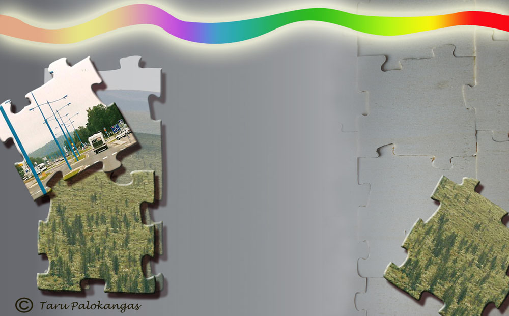 The background layer is a back side of a wooden puzzle. I had some photos of our journey to Northernmost Lapland and made from them by vector graphic puzzle forms. Added shadow with red tinge and color glide with outer glow upper part of picture. The gray background color is for readable colors of letters. The islet on Lake Rahajärvi (Money) pictured in the middle of the night and on the early morning. We were in Inari in Northernmost Lapland some years ago and spend Mid Night Festival there. As you see the sun did not go down at mid night at all it shines behind the islet and made the Islet black. The topmost layer is made by the pattern which is one to three black white.The colors of the texts should be in a balance with another part of photo. The colors are fixed with the parts of flower here. You can also see the difference to use shadow or not with a text. Lady’s Slipper orchid is a protected plant here in Finland. It grows in our village forests.And the same with Beverly emboss.This is made by vector graphic. The parts of Northernmost Lapland and Lake Inari are made with color glides. The lines are effected with shadow.Ice sculptures were quite light and not very visible at the origin picture. Blue color changes the spirit of sculptures. It is a real blue moment. I was coming back from Muonio and Olostunturi (Fjell Olos) to Rovaniemi on February. Just before the sun fell down I drove a car beside the road and took this. I have not done anything to this photo just and the text.Two layers and Beverly emboss cone. Nice harmony colors on later autumn. As I told I had taken a lot of details. This chain is actually a chain of a tractor wheel. The wheels are covered with iron chains to drive on a slippery road and ground. Anyway the chain can be taken where ever. The chain has a shadow which is the same item but it is turn to black and is situated to another back side layer. The ground layer is a color glide and the upper layer is made with pattern.This world is very visual. We are more and more targets of visual messages. Marketing consists in visual commercials. This is an informal part of learning photographic process. I don’t do this often but for me it is a way of learning something new by looking commercials. How they are made? What kind of colors they use? What kind of effect they have? If it is something very impressing I will try to create similar. For those who are interested in photos and processing them there is made a lot of books and web sites. You may search free programs and tutorials from internet if you just get addicted with it. This is a good hobby and takes all of your extra free time.