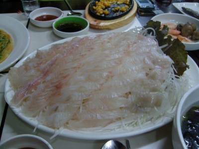 As Korea is peninsula, we also have seafood quite often, and this is raw cutted fish and we eat this with some sauce which is very nice.