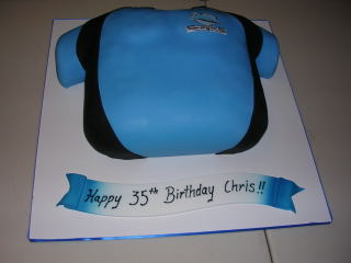 A couple of weeks ago I organised a surprise “unbirthday” party for him – if you’ve never heard of an unbirthday party before (I don’t think it’s a word, actually!), let me explain. Chris’ birthday is actually in January, which is a bad month for a birthday in Oz (Oz = Australia, Chandra) because it’s the middle of the summer holiday so a lot of people are away, and also a lot of restaurants close for a post-Christmas break. Way back in January he’d said he’d like a birthday party later in the year when more people would be able to come and it would be easier to get a venue. I let him think I’d forgotten all about it, but secretly I was plotting with a couple of his mates … We booked a room in a local pub, told Chris he was going to watch a footy match but didn’t tell him that we’d invited pretty much everyone he knows! Anyway, he was absolutely bowled over – no-one had let the cat out of the bag, and we’d even got him a cake in the shape and colours of the jersey of the footy team he supports, the Cronulla Sharks; I’ll be brave and try including a picture - here it is.